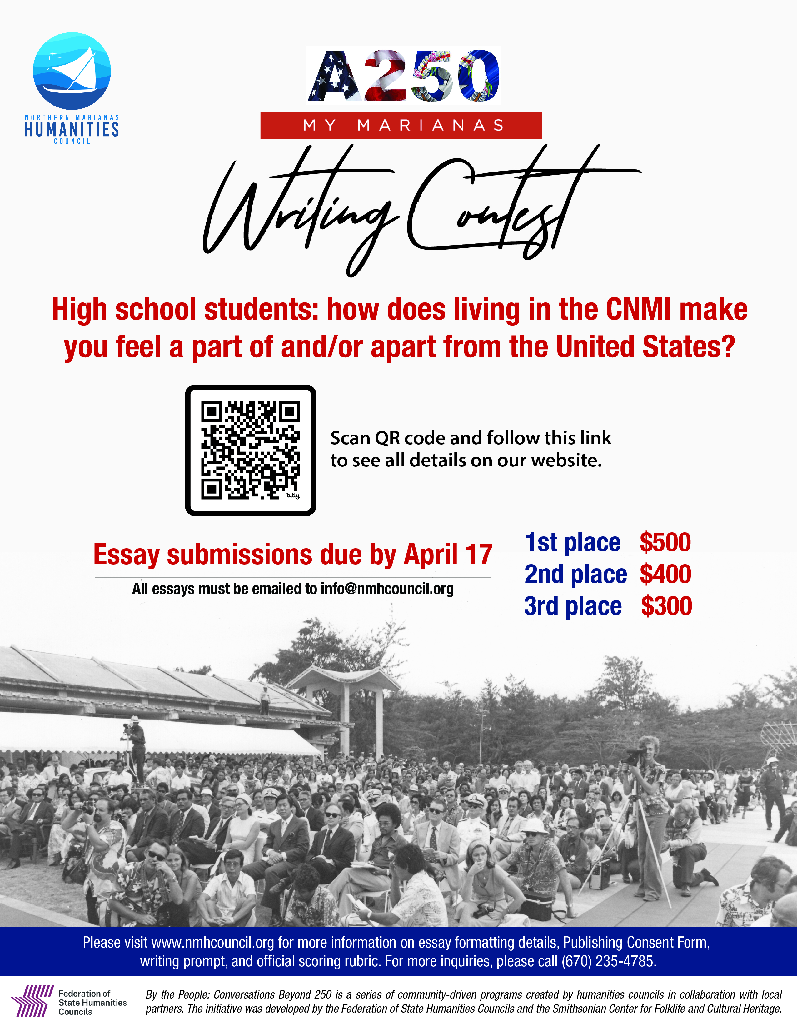 The My Marianas Writing Contest promotes awareness of the diverse experiences and perspectives within the Northern Marianas Islands through published personal narrative essays authored by high school students on themes that examine various aspects of students’ connections to family, culture, and the environment. The top 3 winners receive a cash prize of up to $500, and become published writers with their work featured in the Marianas Variety, an e-book, and a print booklet distributed to participating schools.